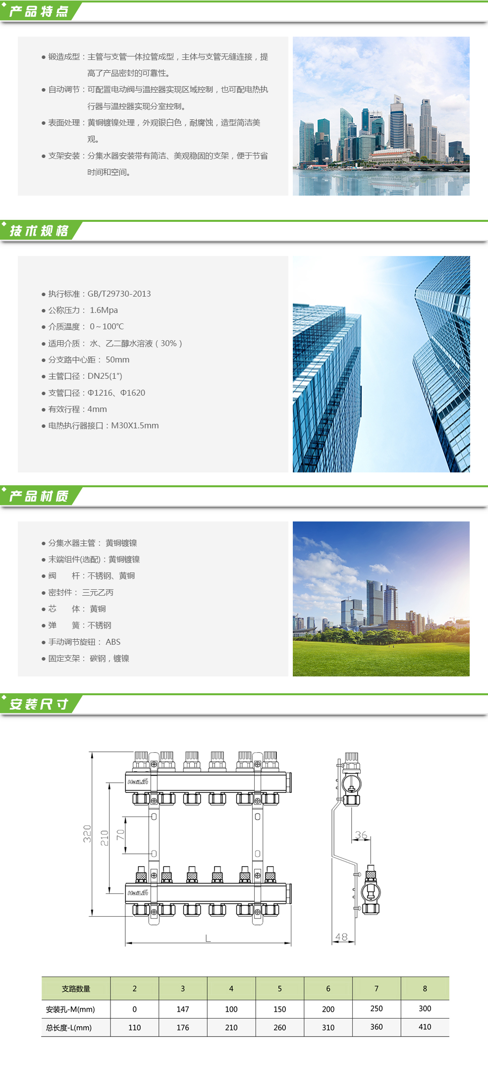 TH35系列分集水器為黃銅整體型材一體式分集水器,適用于地板采暖系統(tǒng),控制輻射地板采暖系統(tǒng)的熱能。分集水器各回路均內(nèi)置了調(diào)節(jié)水量的閥芯??杉友b電熱執(zhí)行器和溫控實(shí)現(xiàn)獨(dú)立分室度制。用戶根據(jù)需要可自行設(shè)定室溫,溫控器會(huì)自動(dòng)檢測(cè)房間溫度,并向執(zhí)行器輸出信號(hào),關(guān)閉或打開(kāi)此房間的執(zhí)行器,使室溫保持在設(shè)定溫度范圍內(nèi)。也可以在分集水器主管上加裝電動(dòng)閥,與溫控器配套使用。從而實(shí)現(xiàn)區(qū)域控制的要求,達(dá)到溫暖、舒適、節(jié)能的效果。