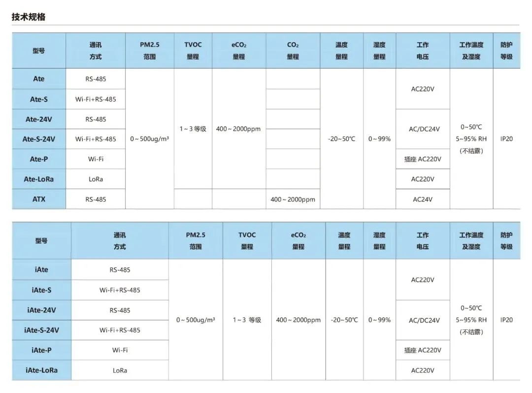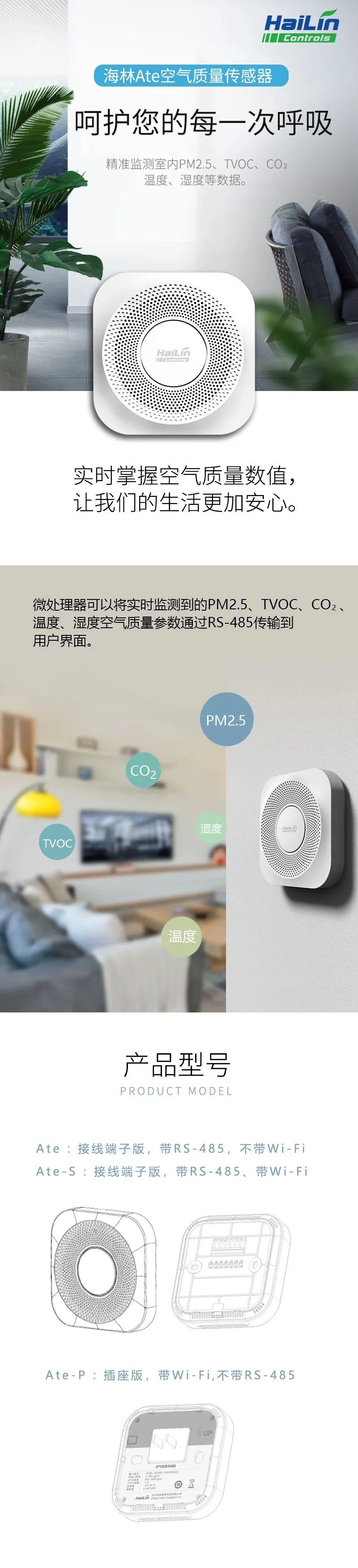 海林Ate 是一款五合一的空氣質(zhì)量傳感器,用于室內(nèi)多種空氣參數(shù)的測量,包括溫度、濕度、PM2.5、CO?/eCO? 和 TVOC。配備 Wi-Fi、RS-485、LoRa 或 ZigBee 等多種通訊方式, 適用于各種樓宇自控系統(tǒng)。