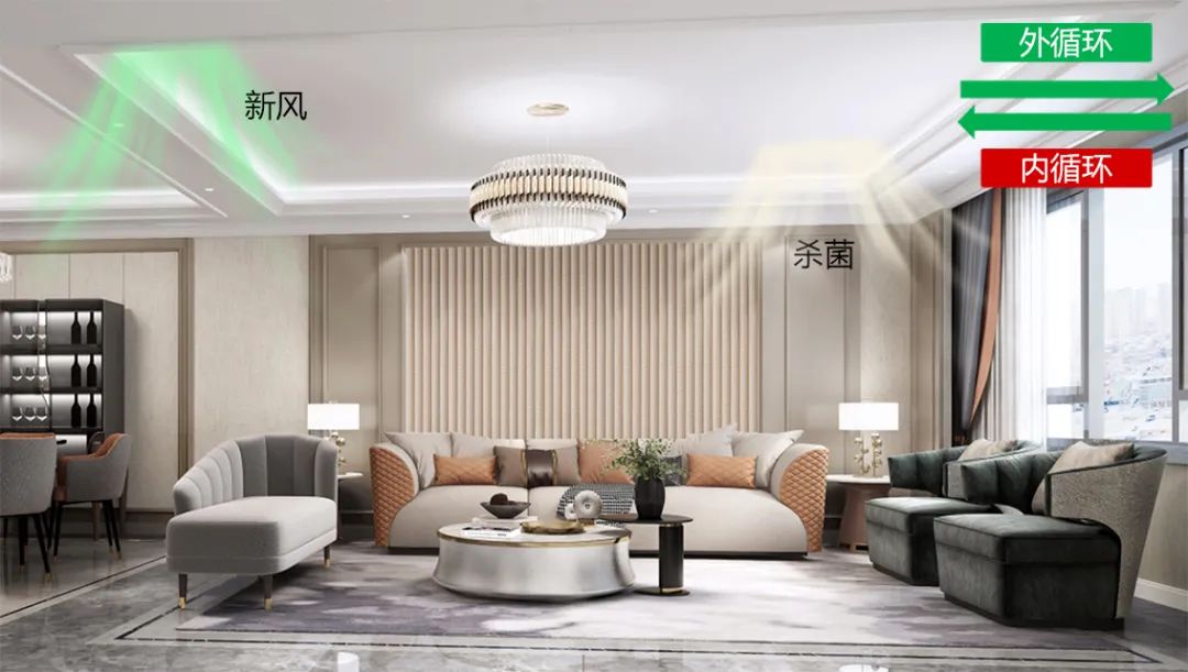 當(dāng)室內(nèi)較大顆粒(5~10μm以及大于10μm,通常為飛沫、灰塵、花粉等)指數(shù)比較高時(shí),容易讓細(xì)菌和病毒長(zhǎng)期滯留在室內(nèi)環(huán)境中,系統(tǒng)此時(shí)會(huì)自動(dòng)開(kāi)啟新風(fēng)凈化設(shè)備,通過(guò)凈化濾網(wǎng)降低較大顆粒物的存留;