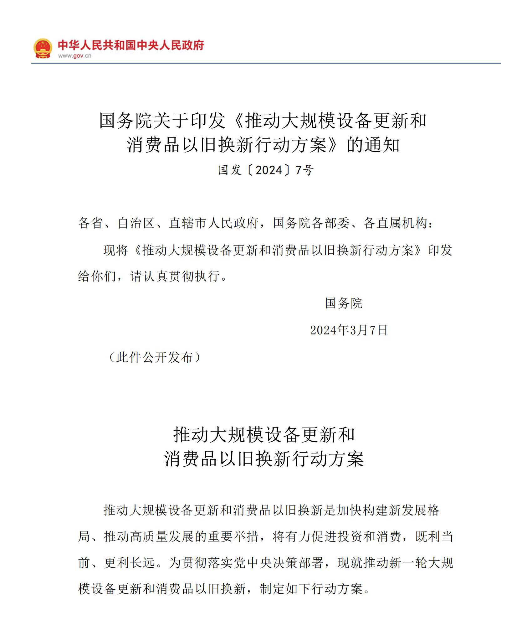 3月13日晚間,國(guó)務(wù)院正式印發(fā)《推動(dòng)大規(guī)模設(shè)備更新和消費(fèi)品以舊換新行動(dòng)方案》。
