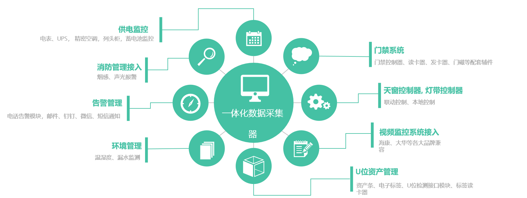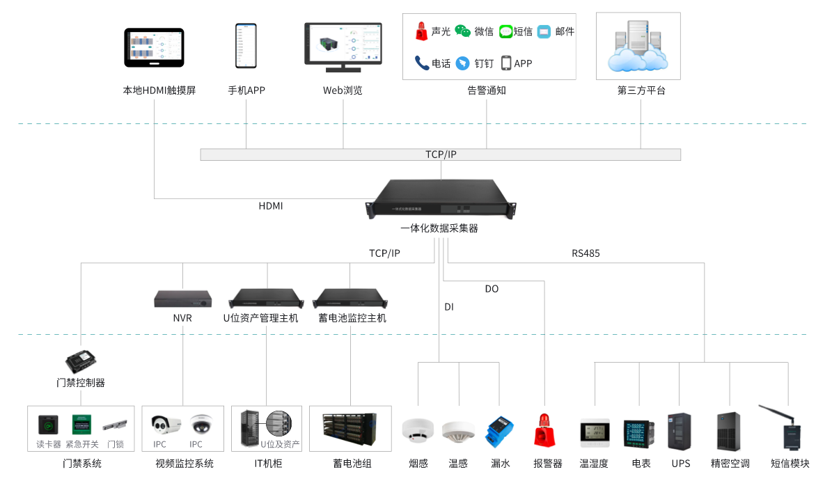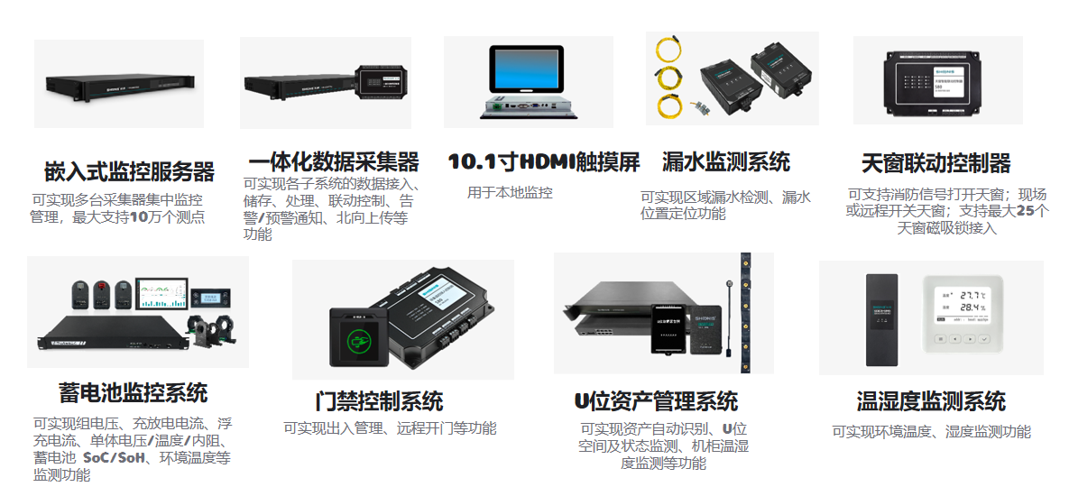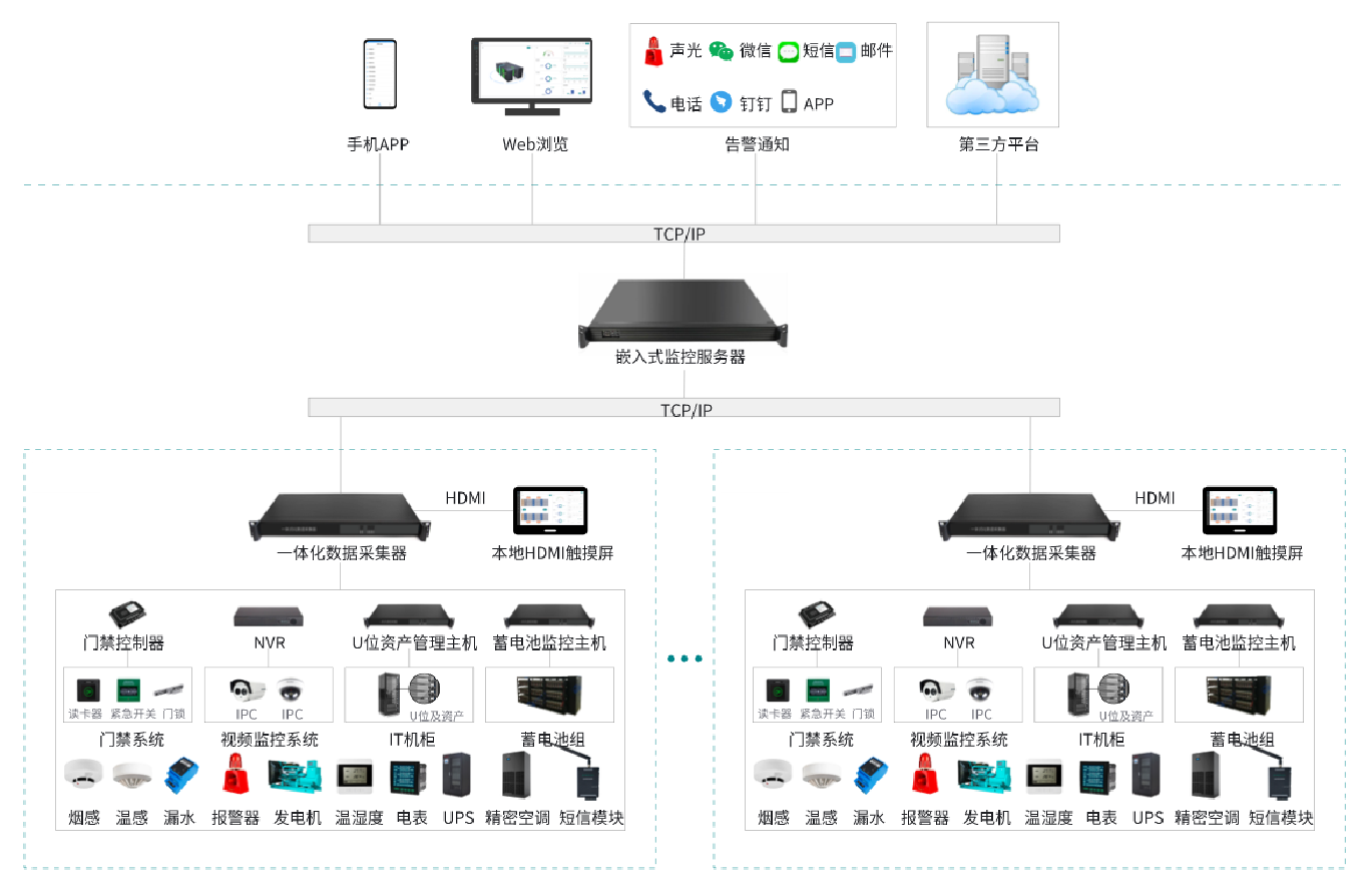 該系統(tǒng)由:嵌入式監(jiān)控服務(wù)器、一體化數(shù)據(jù)采集器、HDM觸摸屏、漏水監(jiān)測系統(tǒng)、天窗聯(lián)動(dòng)控制器、蓄電池監(jiān)控系統(tǒng)、門禁控制系統(tǒng)、U位資產(chǎn)管理系統(tǒng)、溫濕度監(jiān)控系統(tǒng)組成