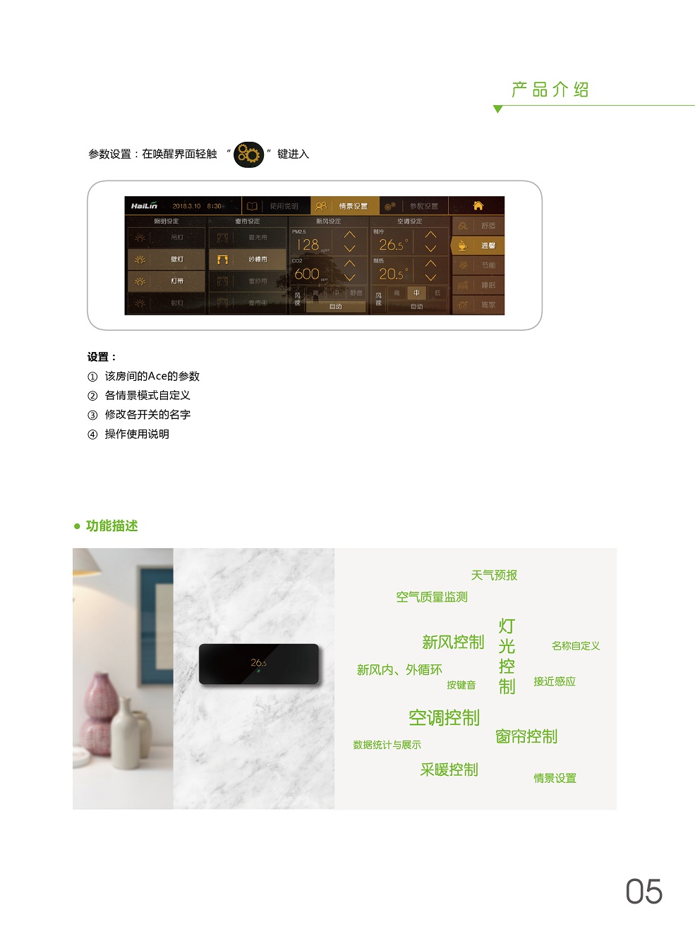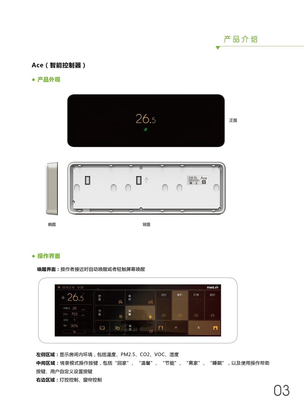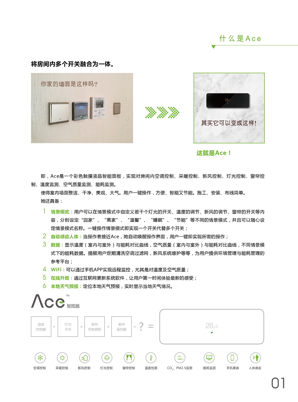 ACE將溫度控制、燈光控制、窗簾控制、新風控制、空氣檢測集于一身,采用控制模塊集中控制,控制面板弱電連接方式,極大程度減少布線及人工成本。ACE+自學習,不斷優(yōu)化用戶使用習慣,減少生活浪費,ACE就是您身邊的隱形管家。