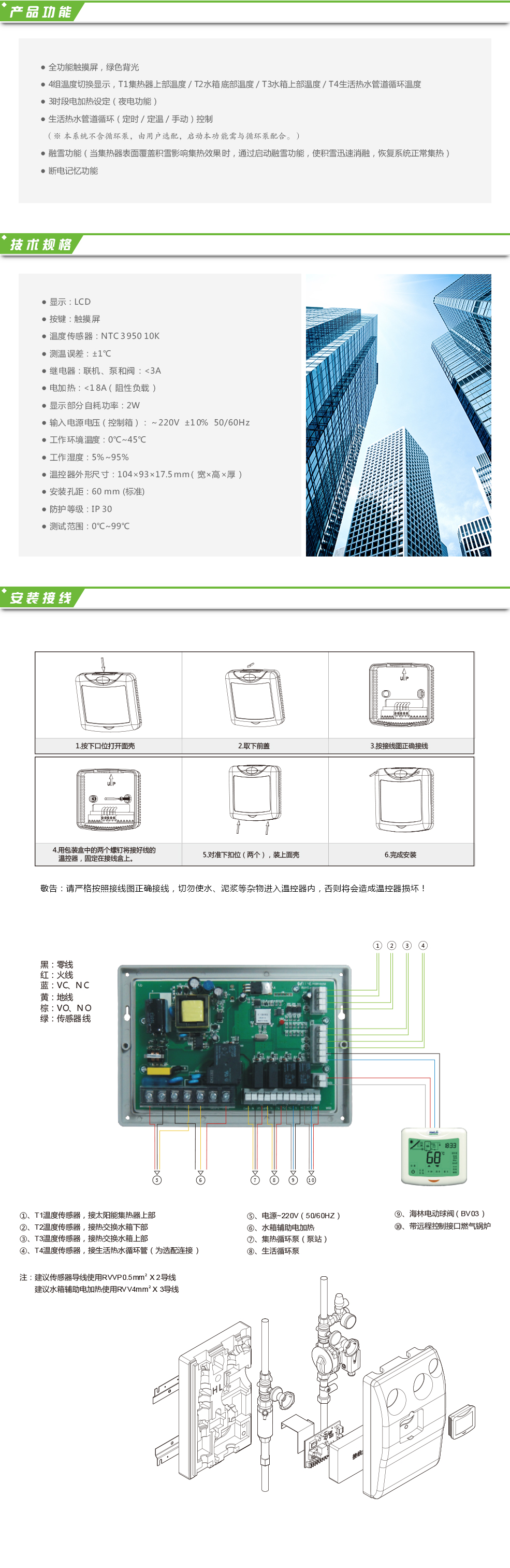 HS2018分體式太陽能熱水器控制器應用于太陽能熱水系統(tǒng)的智能化監(jiān)控與管理。采用綠色背光,液晶觸摸屏,控制主板與控制面板分離式設計,并通過溫差和實時通訊,來控制太陽能集熱器端與水箱端熱交換循環(huán)泵、用戶端生活熱水循環(huán)泵和定時啟動輔助電加熱等設備,以實現(xiàn)系統(tǒng)自動運行,方便用戶使用的目的。