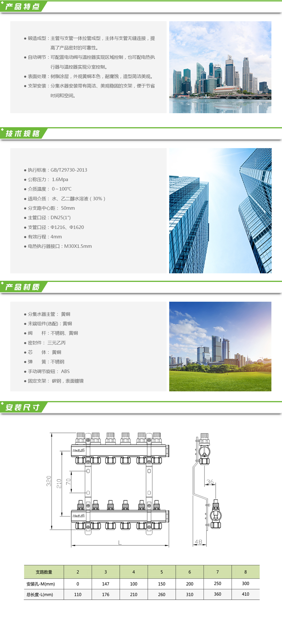 TH36系列分集水器為黃銅整體型材一體式分集水器,適用于地板采暖系統(tǒng),控制輻射地板采暖系統(tǒng)的熱能。分集水器各回路均內(nèi)置了調(diào)節(jié)水量的閥芯??杉友b電熱執(zhí)行器和溫控器實(shí)現(xiàn)獨(dú)立分室溫度控制。用戶根據(jù)需要可自行設(shè)定室溫,溫控器會(huì)自動(dòng)檢測(cè)房間溫度,并向執(zhí)行器輸出信號(hào),關(guān)閉或打開此房間的執(zhí)行器,使室溫保持在設(shè)定的范圍內(nèi)。也可以在分集水器主管上加裝電動(dòng)閥,與溫控器配套 ...